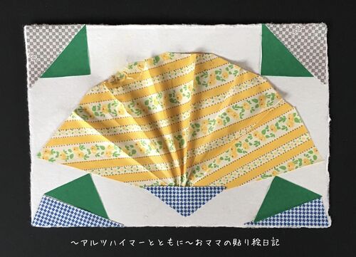 (2019年8月19日 アルツハイマー型認知症の診断から約12年6ヶ月) *裏に謎が…。 この貼り絵、扇に見えます。 実際扇のように折り畳んだ折り紙を使っているのだと、私は思いました。 「これ、元は何だったの?」 とオネコに聞かれた時、私は制作途…