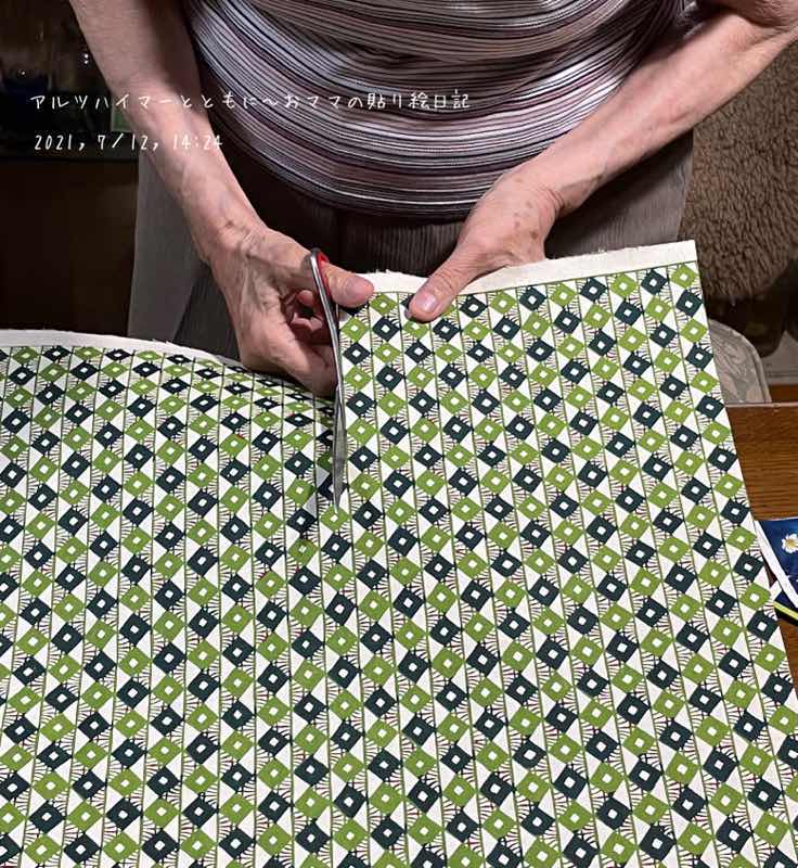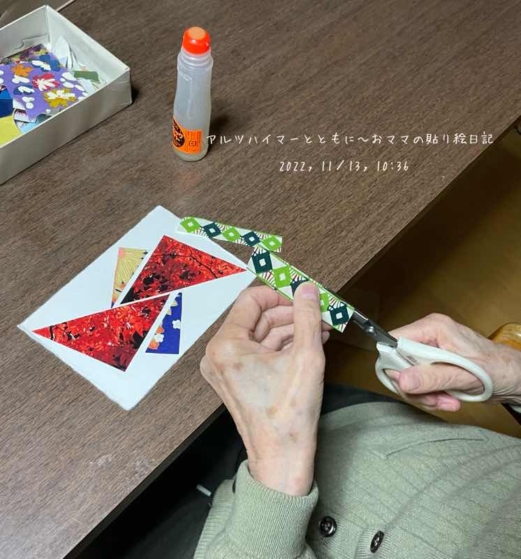 おママは紅葉のメインピースに小さな長方形の和紙を合わせようと考えました。それを2分割しようとしています。斜め対角線に折り目をつけて、ハサミを入れましたが、最後まで切れずに少し戸惑っているところで、おママの手元は画面から外れてしまいました。(^◇^;)